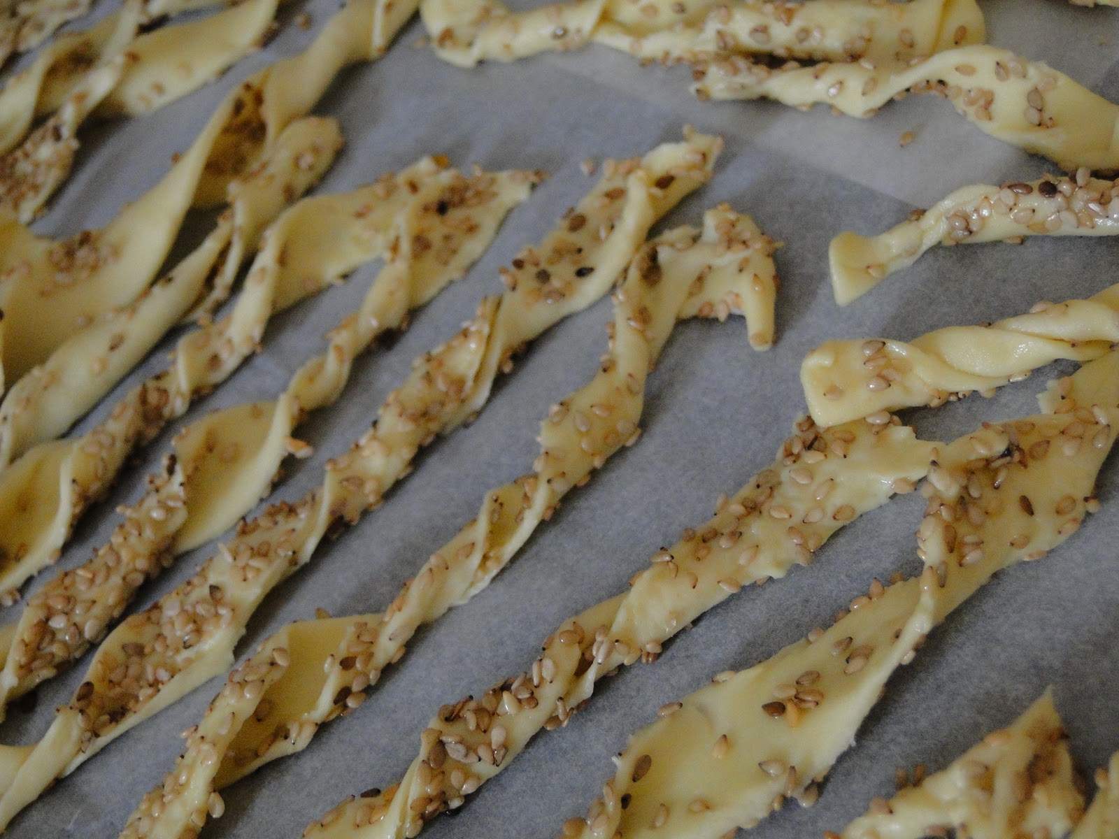 Badigeonner la pâte d'huile, puis saupoudrer les graines de sésame. Coupe des lamelles d'un demi centimètre de largeur et torsader.