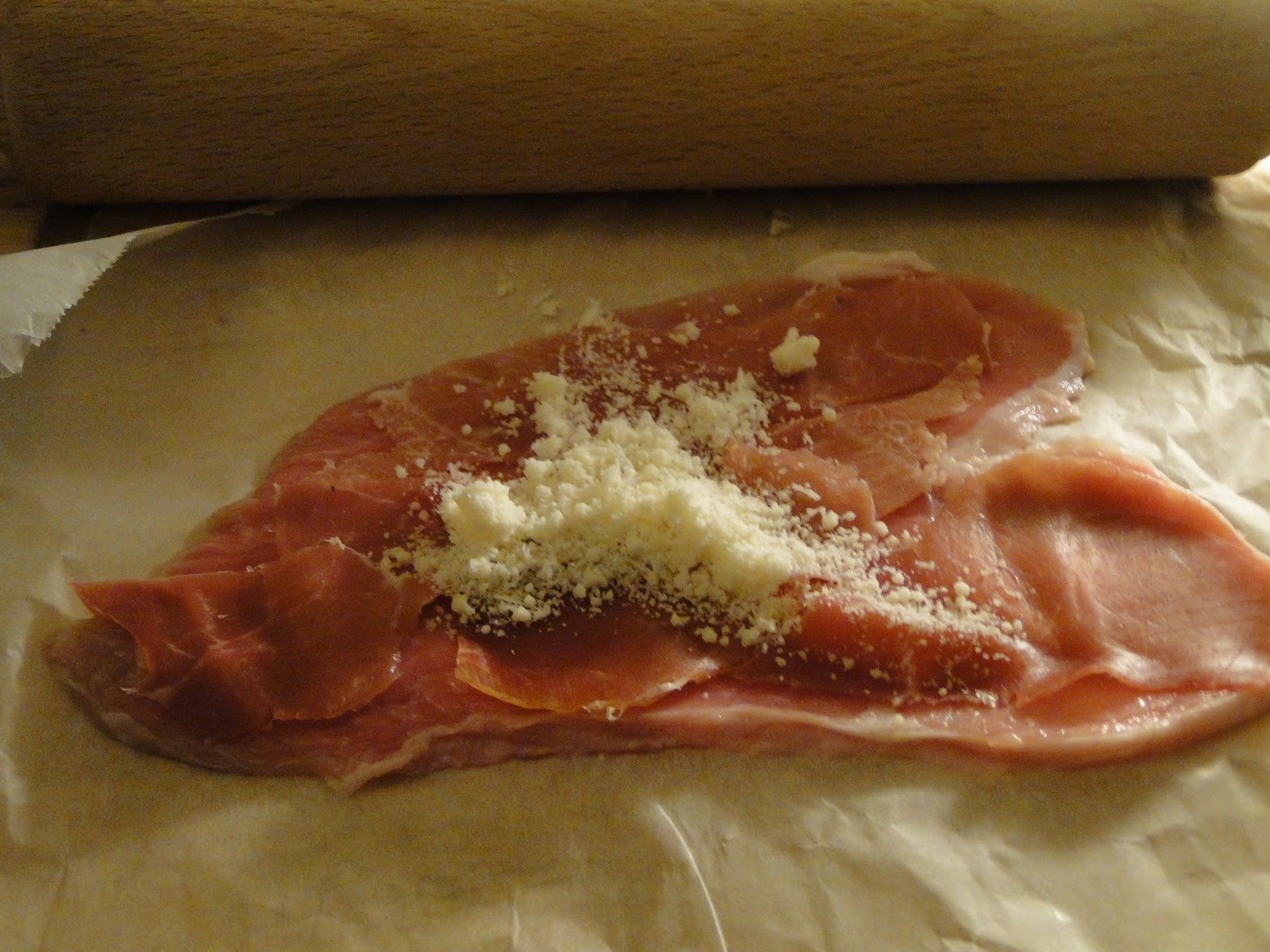Entre un papier sulfurisé et un film alimentaire, étaler l'escalope de veau avec un rouleau. Y mettre du spek et du parmesan.