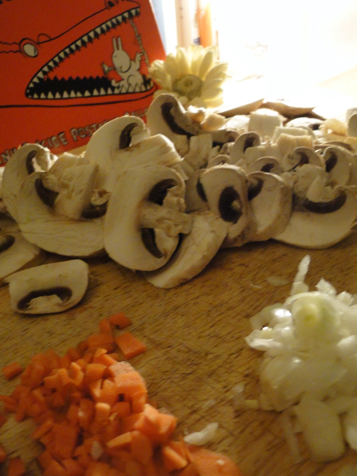 Puis après quelques minutes, ajouter les champignons jusqu'à ce qu'ils dorent puis ajouter du vin (dans mon cas un reste de blanc de blanc).