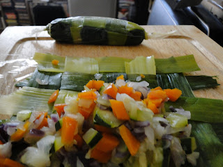 Mais pour les légumes je penses à des ... comment les appeler coussinets verts ... des pois morceaux de carottes dans des feuilles de poireaux