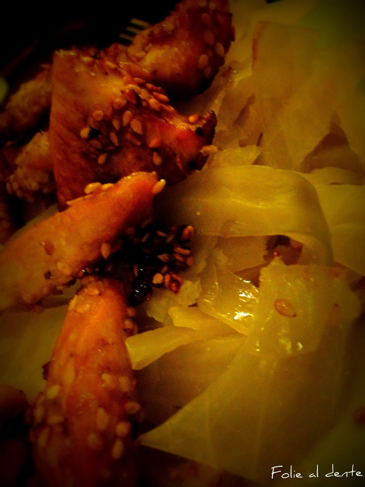 Détailler le chou en lamelles très fines et les cuire à la vapeur (la prochaine fois, dès que j'aurai des plaques électriques, je finirai la cuisson à la bière)