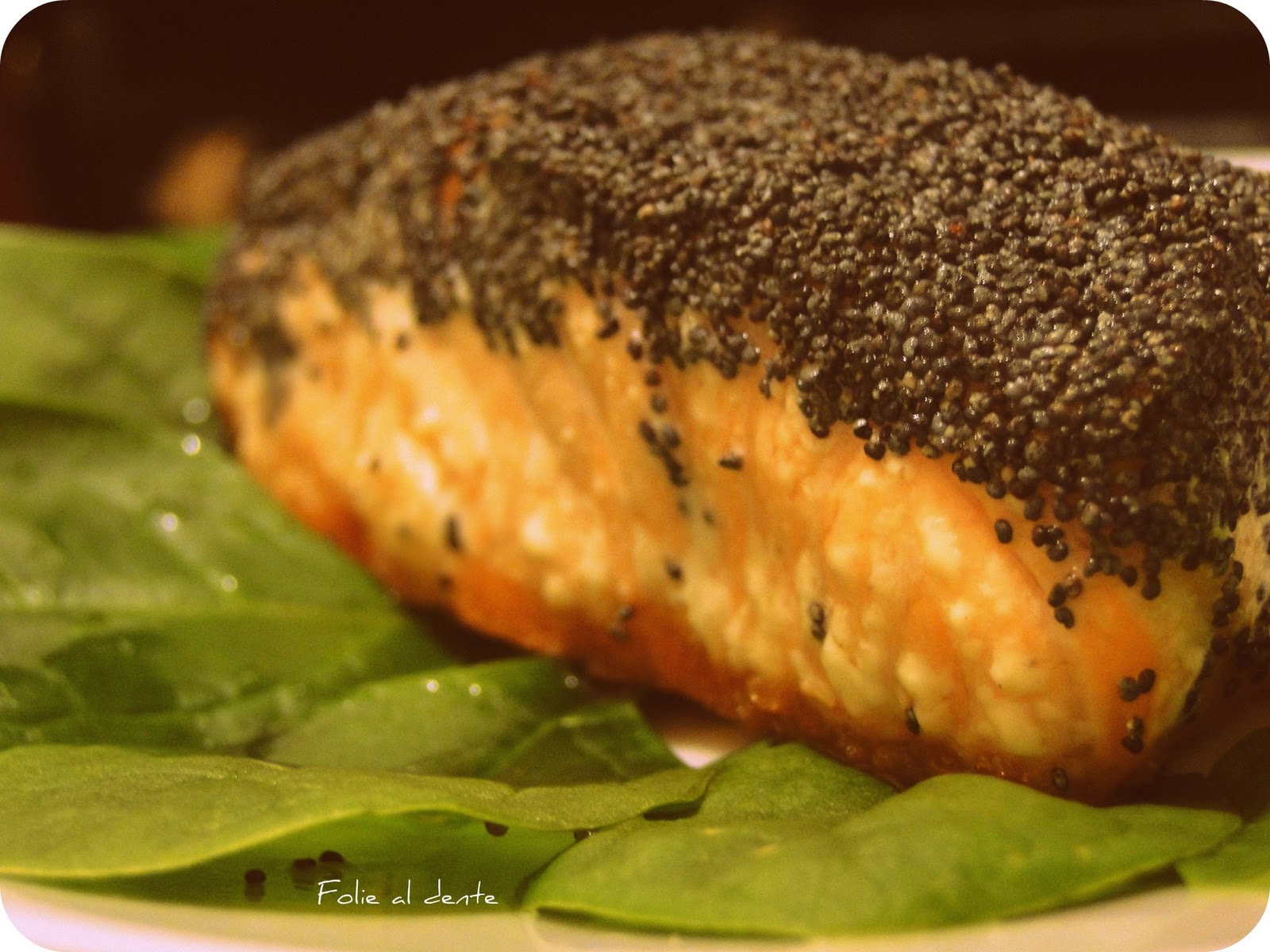 L'un des pavés de saumon frais est coupé en deux. Une face plongée dans les graines de pavot, puis l'autre dans de l'huile d'olive et sel. Selon le conseil du chef du Coupe-chou.