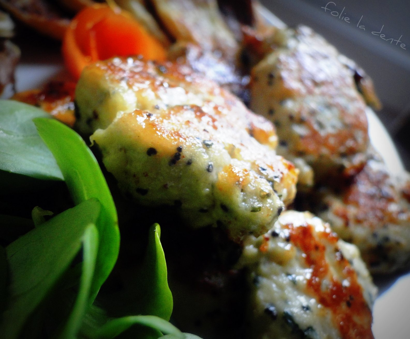 Détailler l'escalope de dinde, l'oignon et mixer (j'utilise le mixeur de chez CuisinOpro) avec le yaourt les graines de pavot. ajouter sel et poivre et former des petites boules. Poêler.