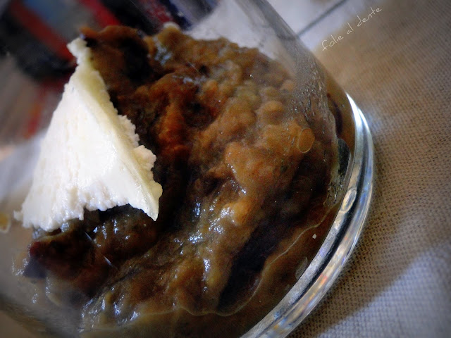 J'ai ajouté une lamelle de chèvre qui, le temps de dresser la table avait légèrement fondu et a épousé le caviar d'aubergine