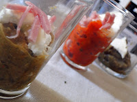 Je sers ce caviar avec un ensemble d'autres verrines et notamment une réplique de ces verrines poivron chèvre, où je remplace la menthe par des allumettes de jambon, et en version rouge et en version verte, et avec des verrines de lasagnes de courgettes que je vais décrire dans le prochain post.
