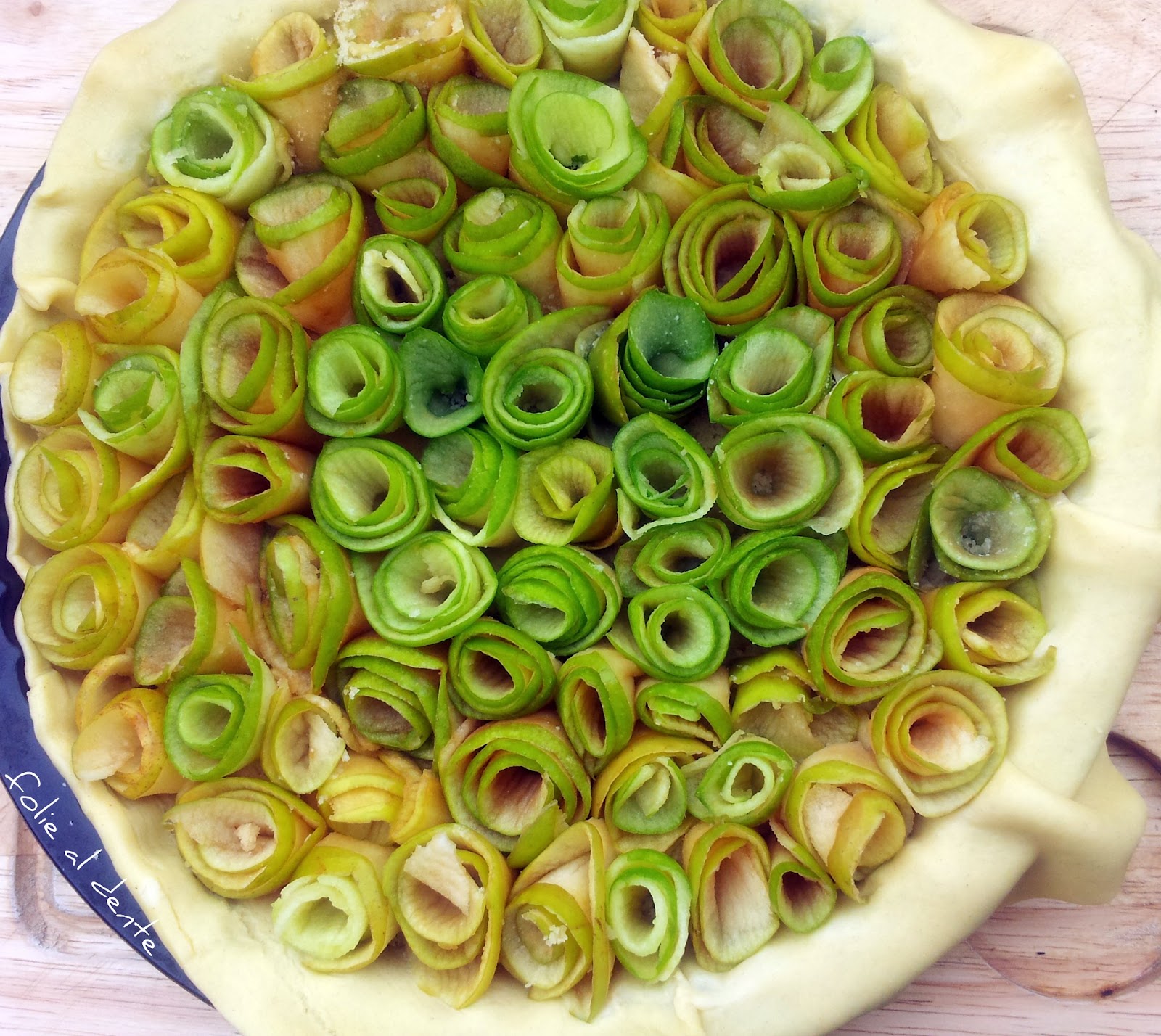 Saupoudrer de poudre d'amandes, le fond de tarte. J'y ajoute un peu de poudre de noisettes. Garnir avec les "pétales" de Pommes obtenues en épluchant les fruits avec un économe. Je les avais arroser et réserver avec du jus de citron.