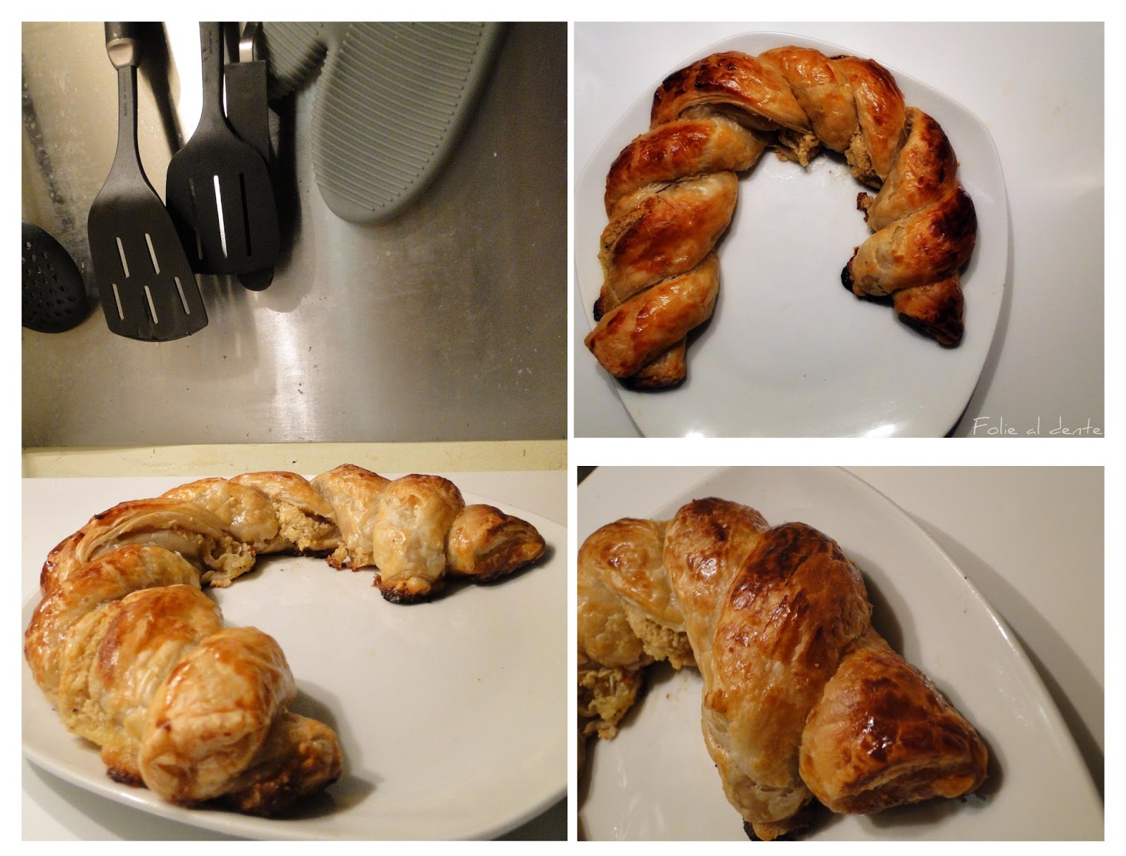 Confectionner deux rouleaux. Pincer les extrémités les tresser et badigeonner d'oeuf battu.