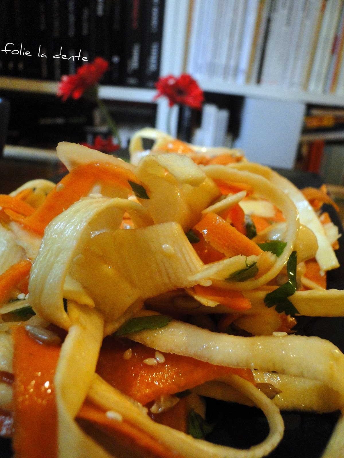 Détailler les carottes, les panais et la racine de persil en julienne à l'aide d'un économe.