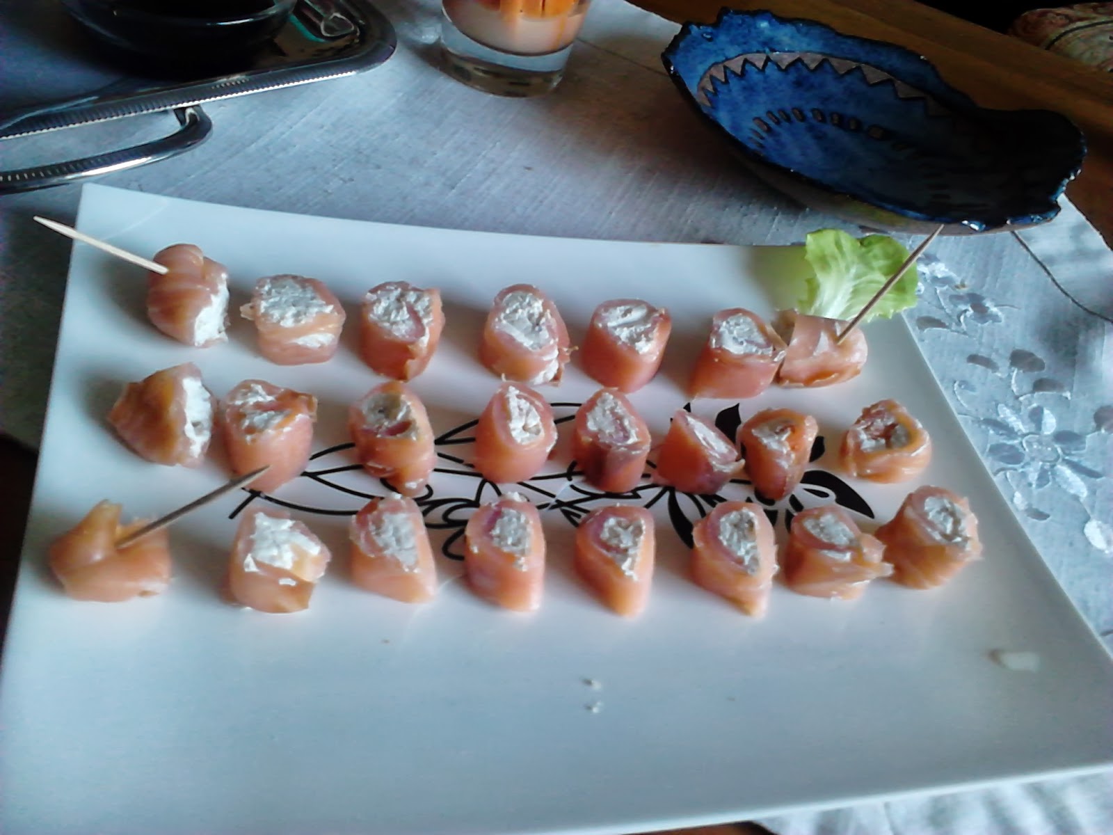 roulés de saumon au fromage frais - tartiner les tranches avec e fromage frais, assaisonner, et rouler. Enrouler dans du filma alimentaire et mettre 20 à 30 minutes au congélateur avant de dépaqueter et couper en tronçons.