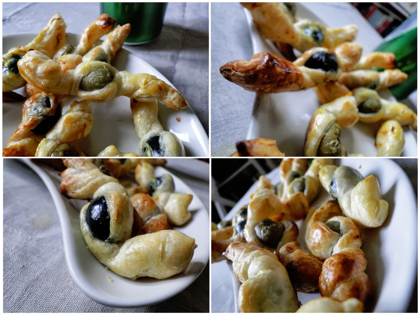 Faire des bandes de 3 x 8 cm et y enrouler les olives.