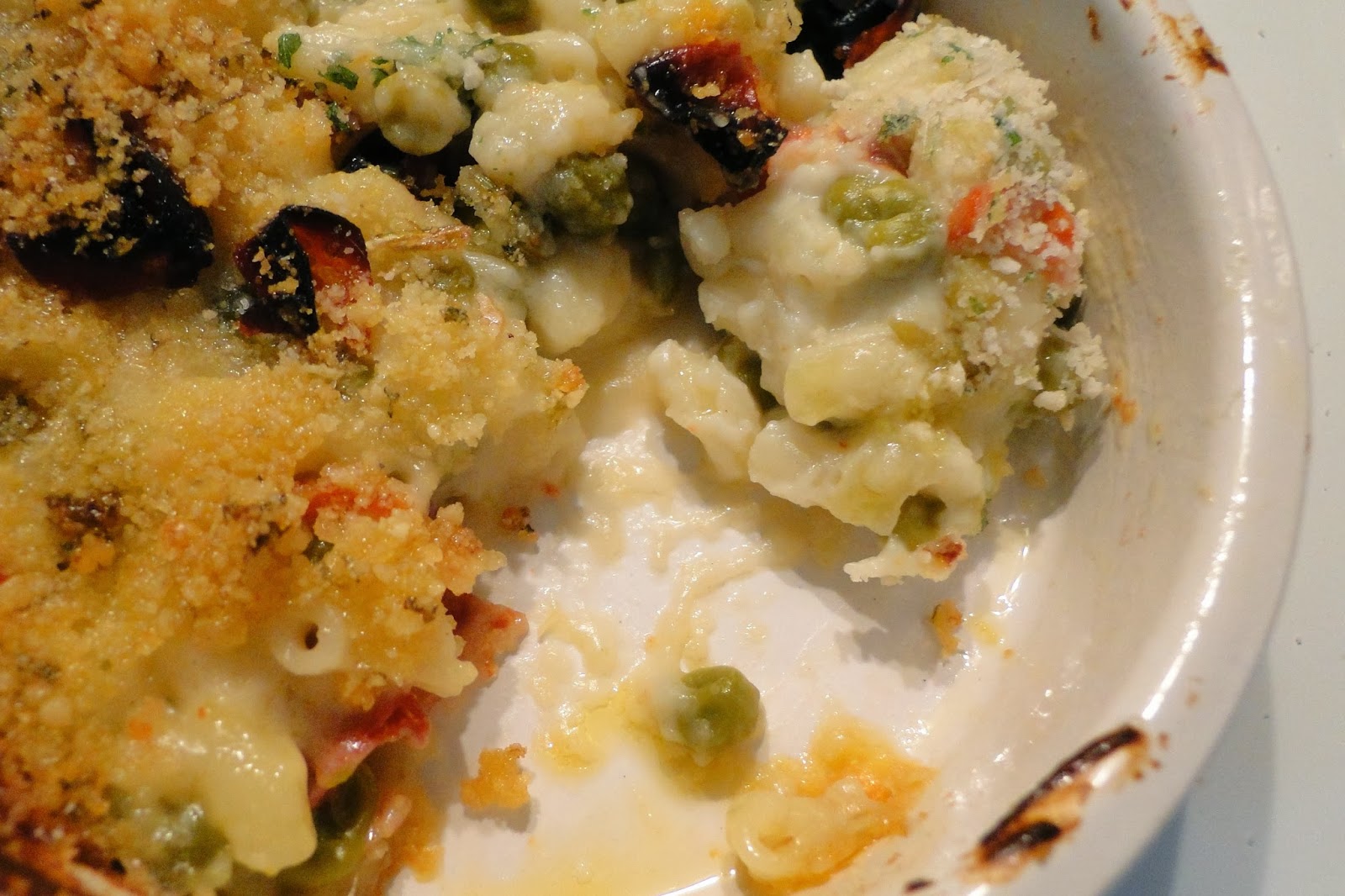 des saucisses, le tout enrobé de fromage et trempant dans une sauce