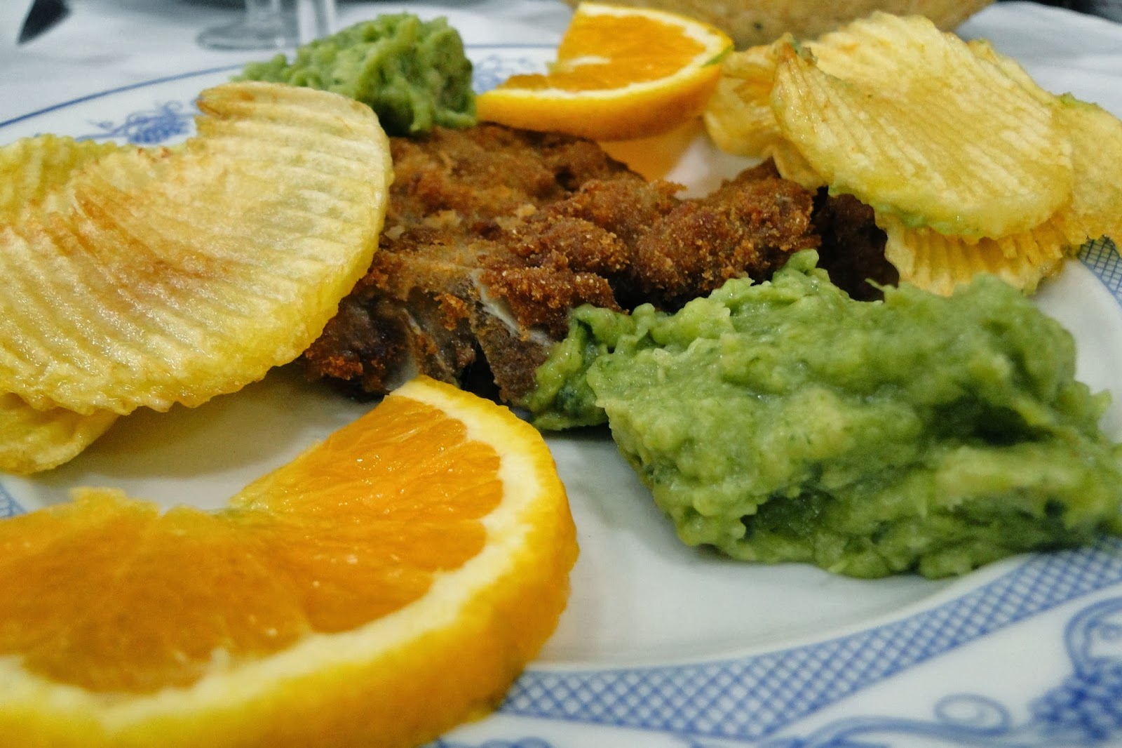 une côte d'agneau panée accompagnée de chips incontestablement faites maison et d'une purée de pommes de terre et épinards.