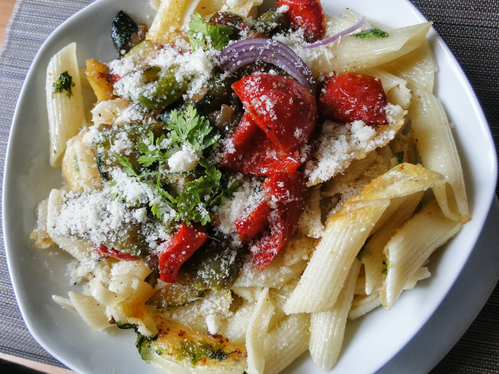Dresser les penne et les légumes en terminant par un trait d'huile d'argan et des feuilles de cerfeuil. Accompagné de parmesan.