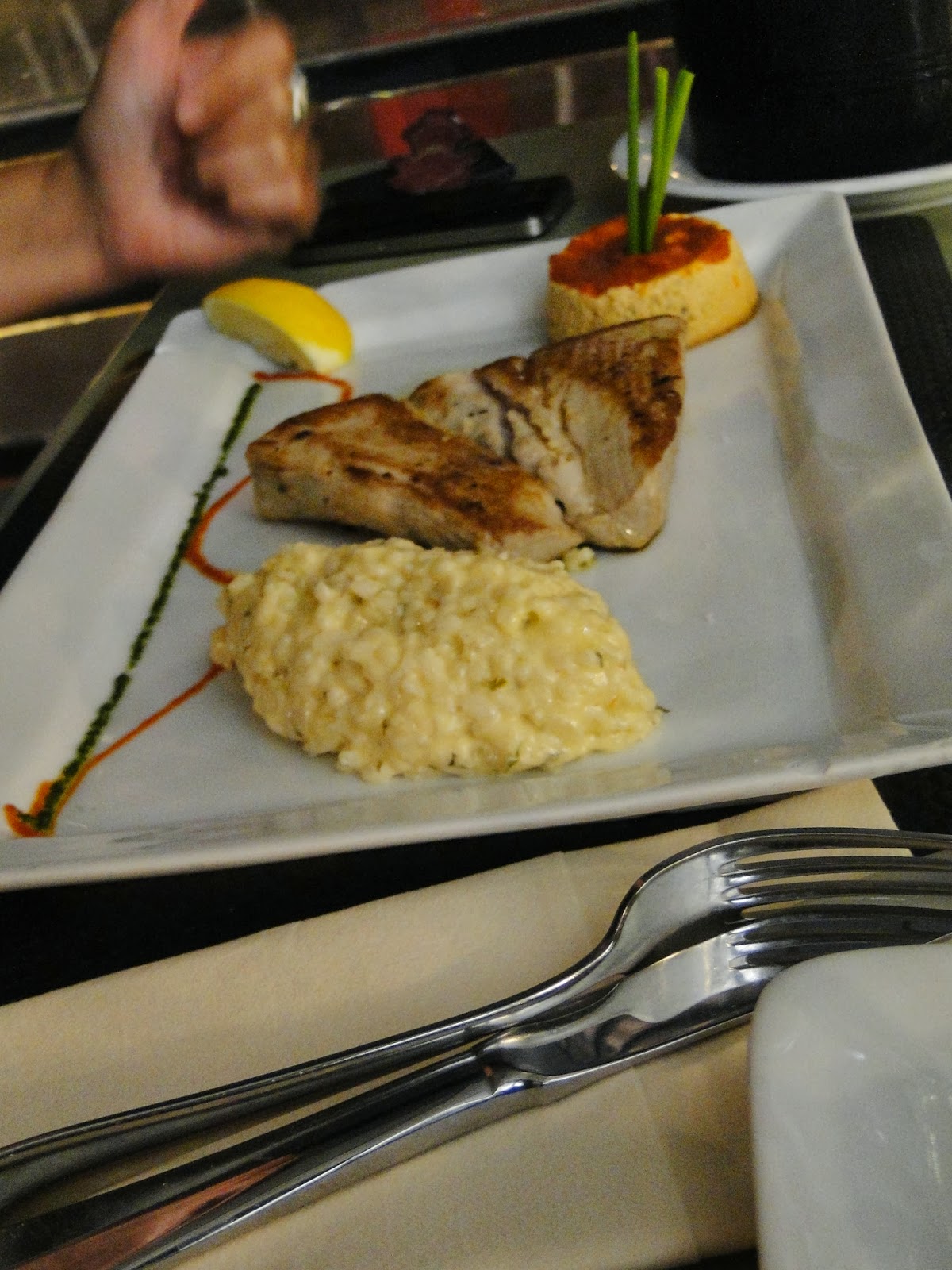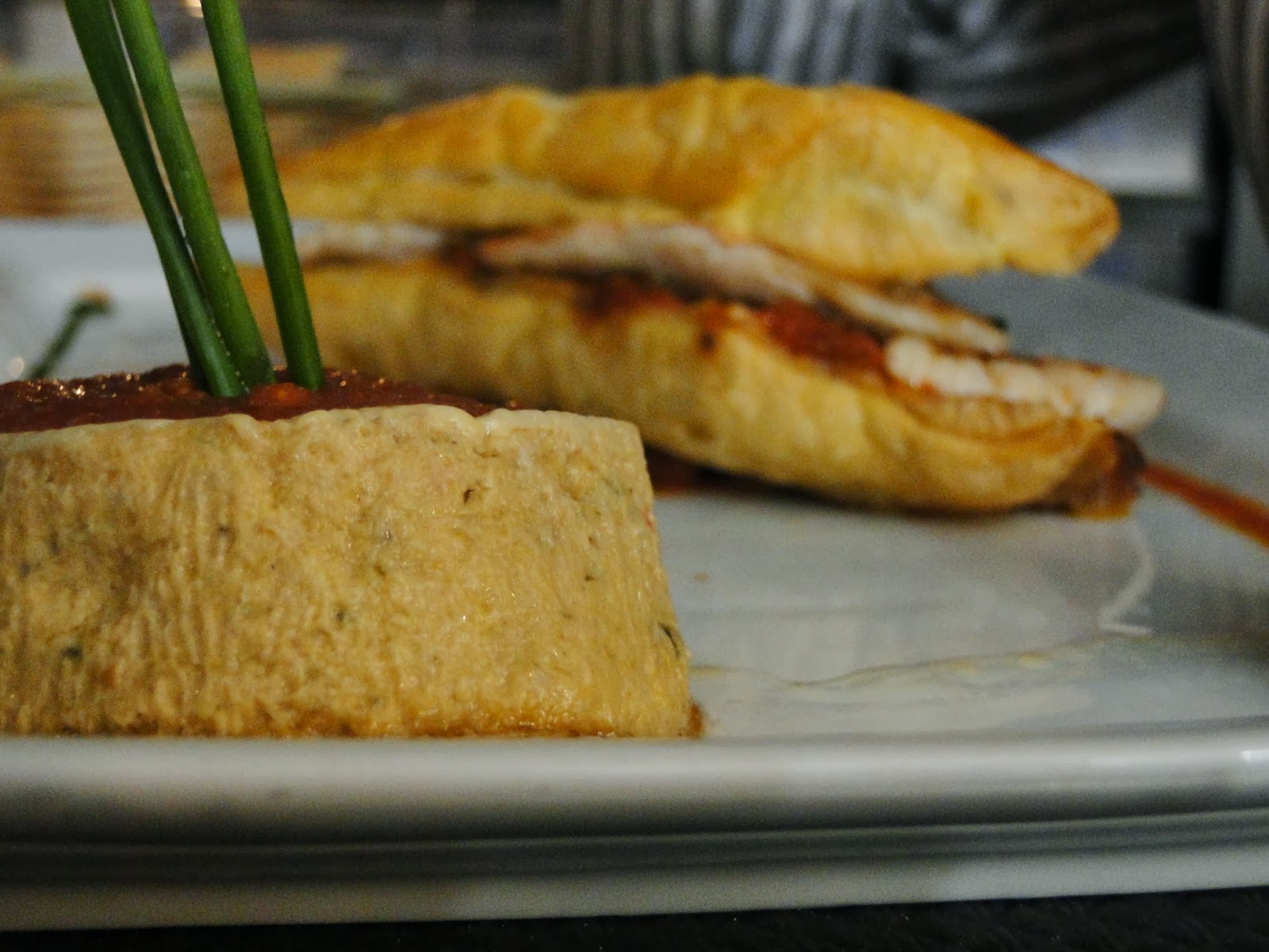 chacun accompagné d'un flan de poivron nappé de sauce tomate et flanqué des trois brins de ciboulette et d'un risotto