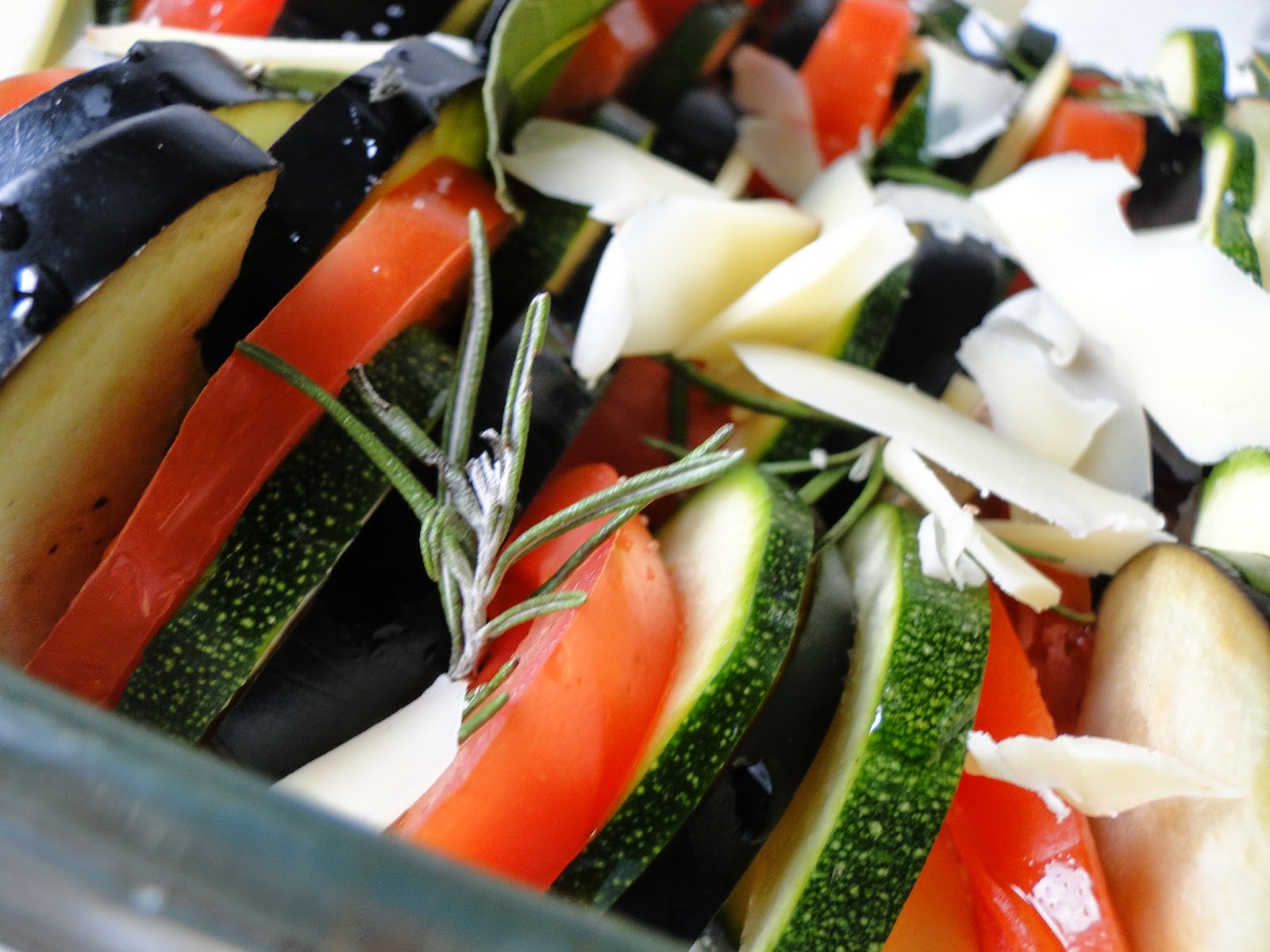 Couper chacun des ingrédients en tranches et les interposer dans un plat huilé et frotté avec de l'ail.