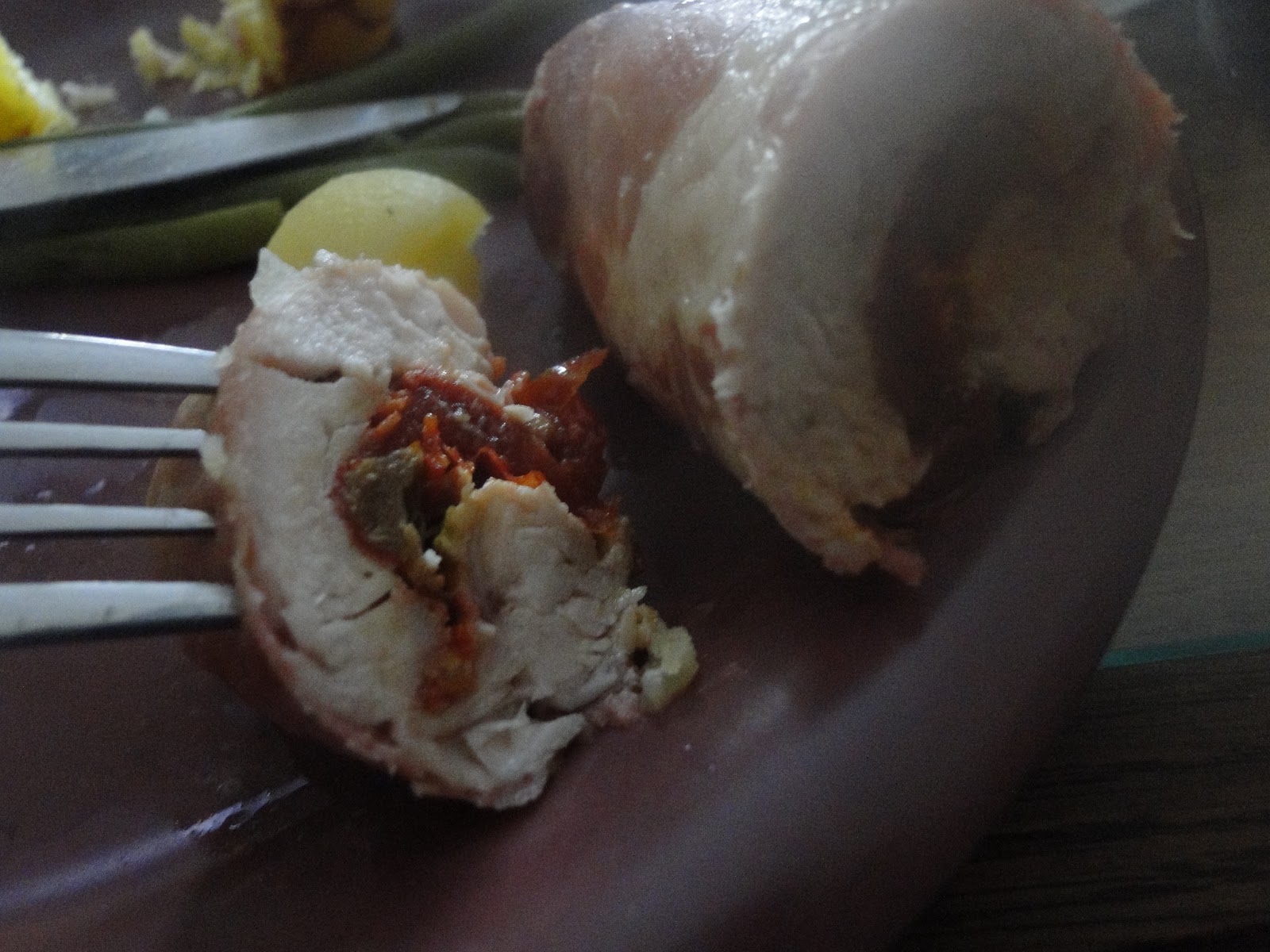 J'aime bien le roulé de poulet, même si au sortir de la cuisson c'est un peu plat comme là et là. Je tente une variante pour plus de goût et plus de visuel.