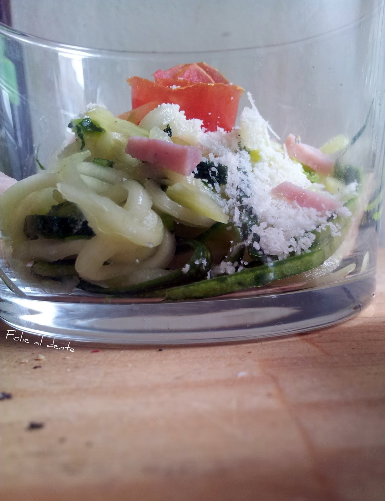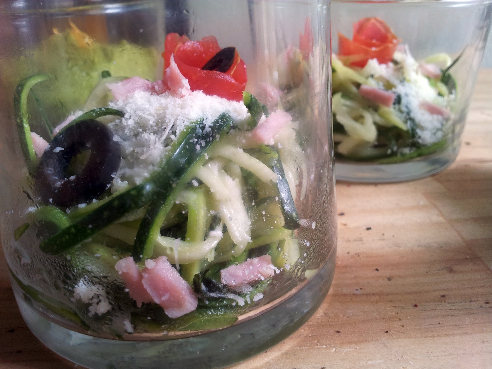 Faire des spaghettis de courgettes avec une mandoline. Les disposer, saupoudrées de basilic finement ciselé et d'un filet d'huile d'olive, dans une passoire métallique au dessus d'une casserole d'eau bouillante, le tout couvert, 3-4 minutes. Elles doivent rester croquantes. Les dresser dans des verrines avec des fleurs de tomates, des lamelles de jambon et saupoudré de parmesan.