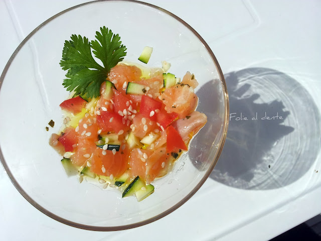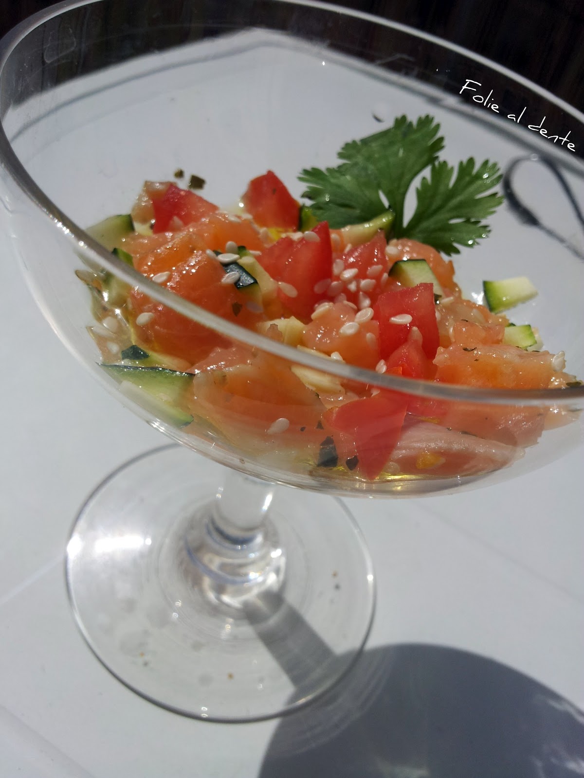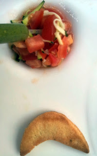 Détailler les tomates en petits dés et les courgettes en très très fines lamelles. Mélanger avec de l'huile d'olive au basilic.