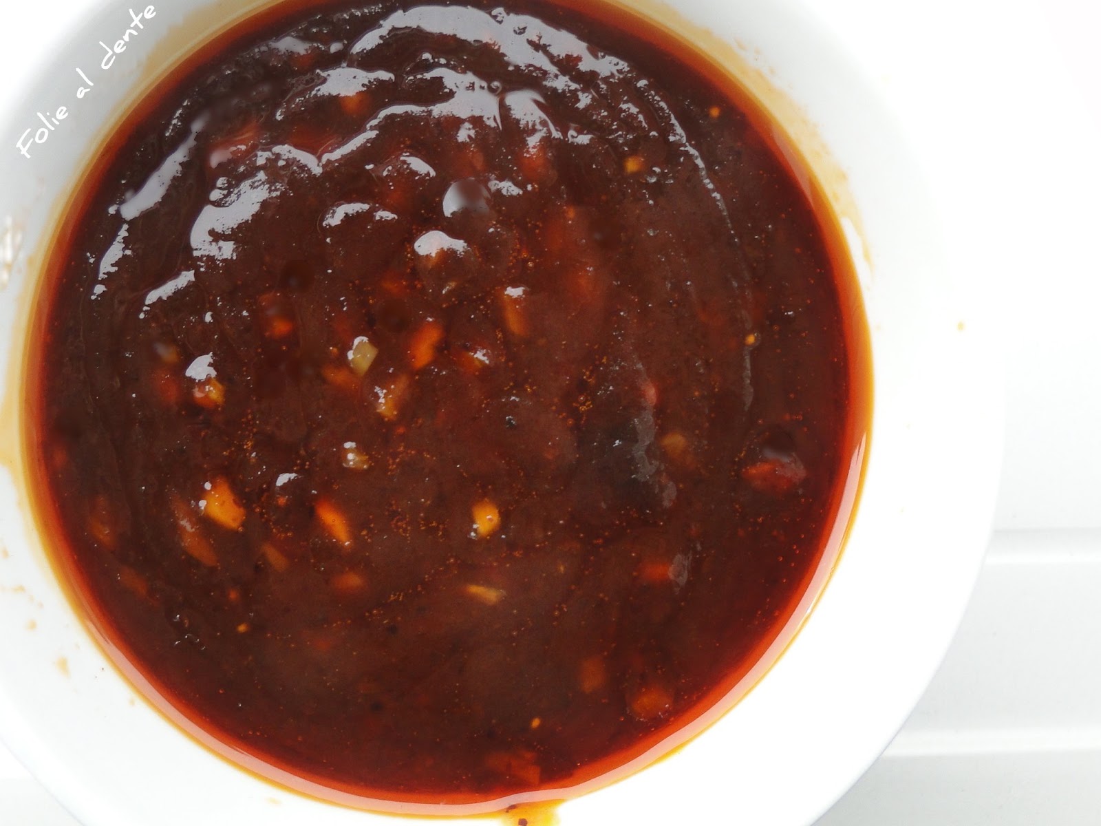faire chauffer de l'huile dans une poêle. Y ajouter le piment en poudre, puis après quelques instants le gingembre et l'ail frais très très finement émincé. Laisser revenir à feu doux. Lorsque l mélange embaume votre cuisine y adjoindre l'huile de sésame, une purée de piment un peu allongée, puis de la sauce soja. Laisser mijoter.