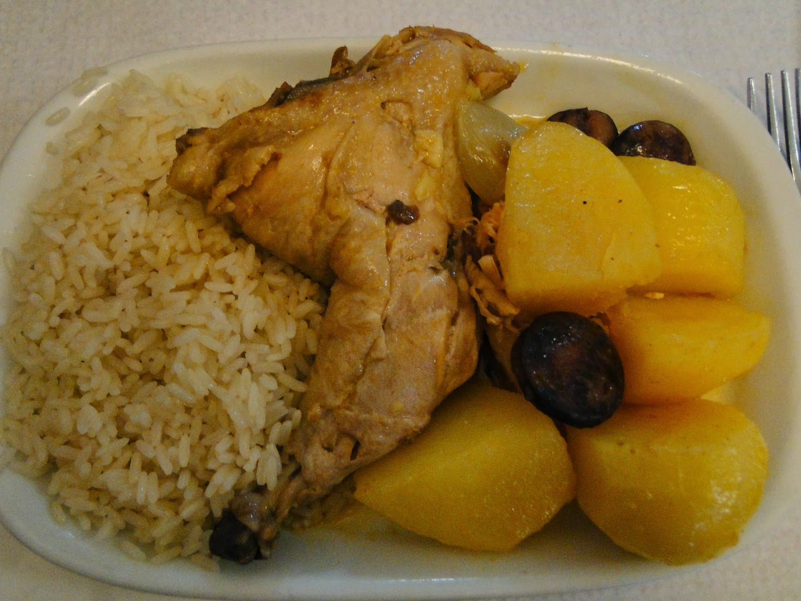 et du poulet revenu avec du chorizo et du sangsue qui me sera servi avec des pommes de terre bouillies et du riz