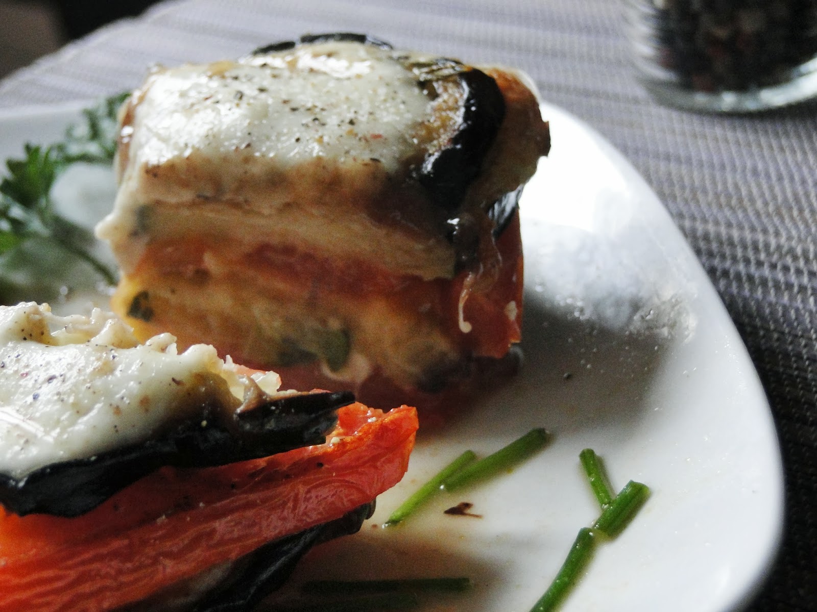 Comme accompagnement, pas de pâtes comme préconise Alice Toklas, mais un Tian... vertical ! comme déjà testé là. Cette fois, j'adapte à ce que j'ai lu dans quantité des recettes relatées dans La vie al dente de Stefania Giannotti : faire dégorger l'aubergine avec du gros sel, poêler les rondelles, et refroidir dans du papier absorbant.