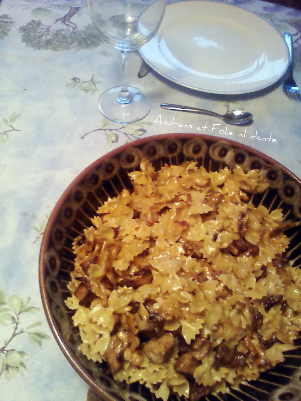Elles avaient été cuites dans le jambon sec. Et ces délicieuses pintades étaient accompagnées de farfalle aux cèpes et noix. et des carottes poêlées et caramélisées.