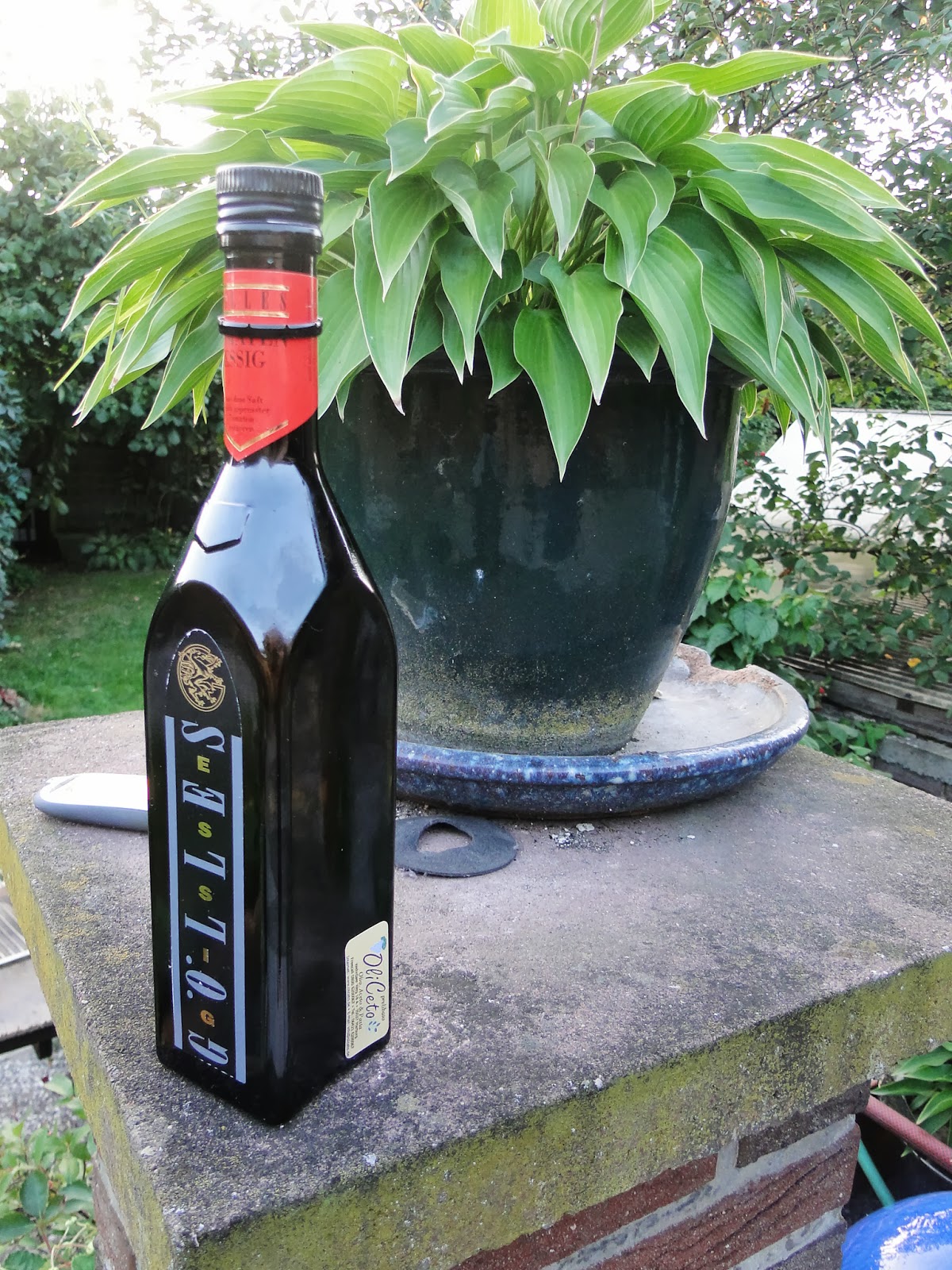 Après des assiettes de melon et jambon cru - un melon goûtu - Andreas reprend le sanglier froid et l'accompagne sur une assiette d'une sauce aux airelles moutarde et vinaigre de framboise surmontée de petites feuilles et d'une fleur de menthe citronnée du jardin. A côté des framboises rouges et blanches du jardin !