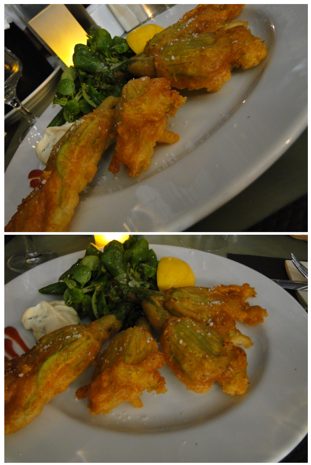 chacun accompagné d'un flan de poivron nappé de sauce tomate et flanqué des trois brins de ciboulette et d'un risotto